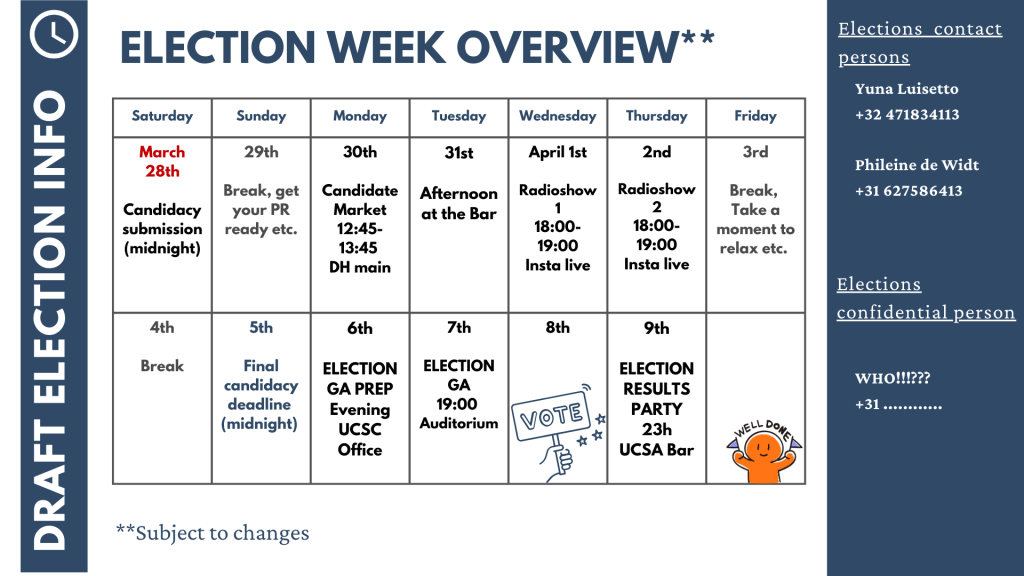 The final deadline to participate in the UC Student Council elections is Sunday March 28th, 2026, at 23:59. Please submit your election statement (maximum one page), a short introductory video (no longer than 30 seconds), and aphoto we can use for PR by sending them in an email to ucu.studentcouncil@uu.nl